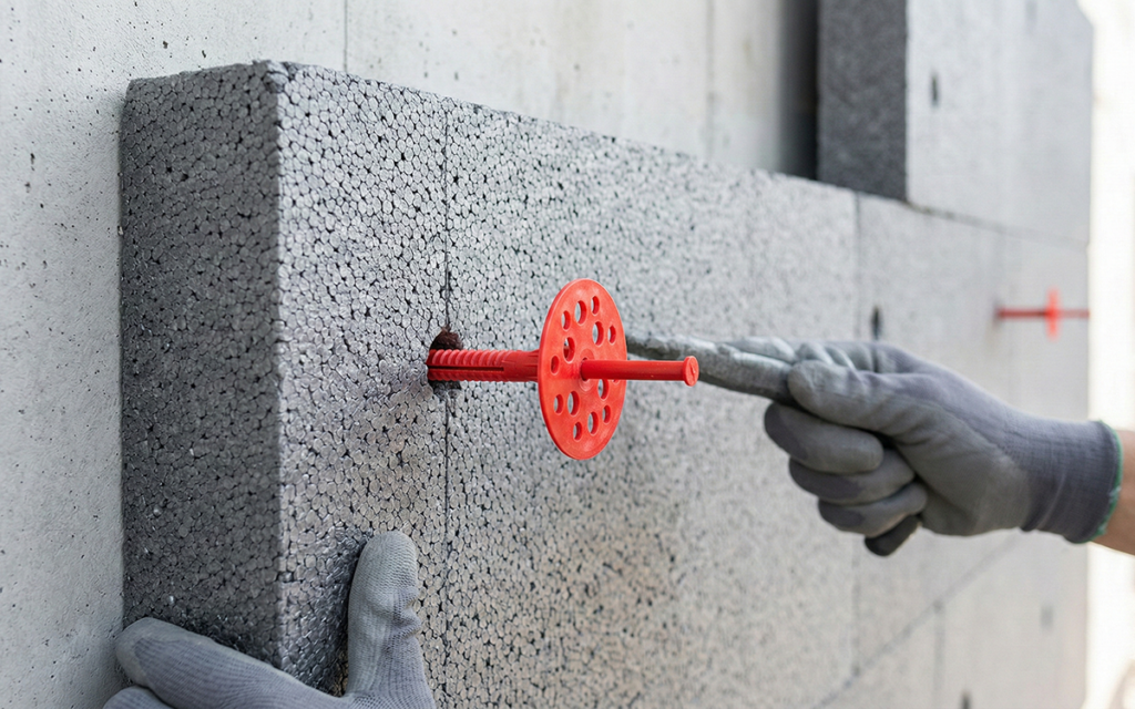 • Kőzetgyapotnál: Mivel az anyag nehezebb, itt minden esetben fém beütőszeges dűbelt használunk a nagyobb teherbírás érdekében.