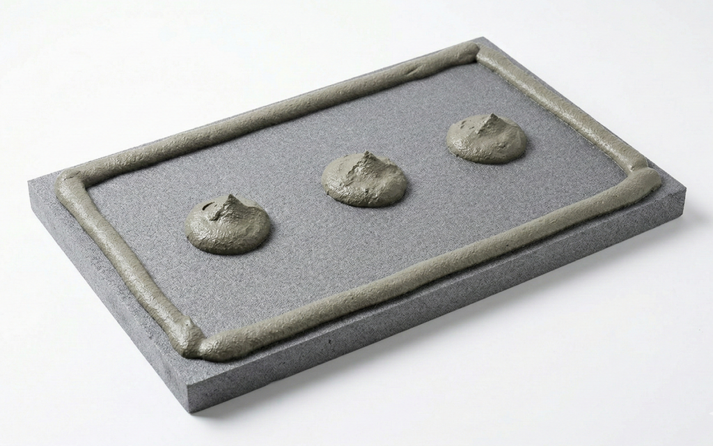 A teljes felületű ragasztást (fogas simítóval) csak akkor alkalmazzuk, ha a fogadó falfelület tökéletesen egyenes (pl. új építésű csiszolt tégla vagy simított beton). Régi, egyenetlen falaknál a perem-pont módszerrel tudjuk korrigálni a fal hibáit úgy, hogy a rögzítés közben a lapok síkban maradjanak.